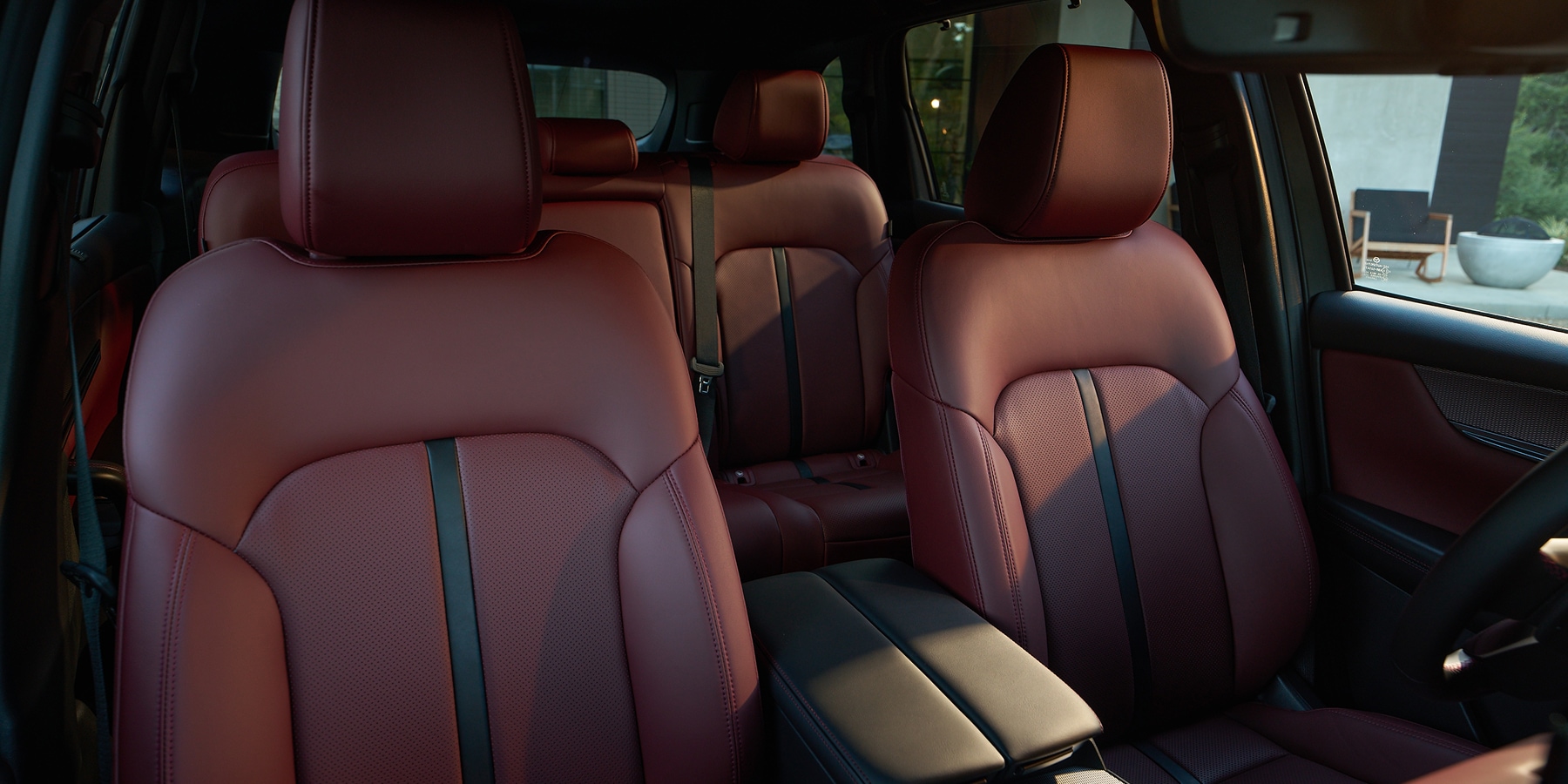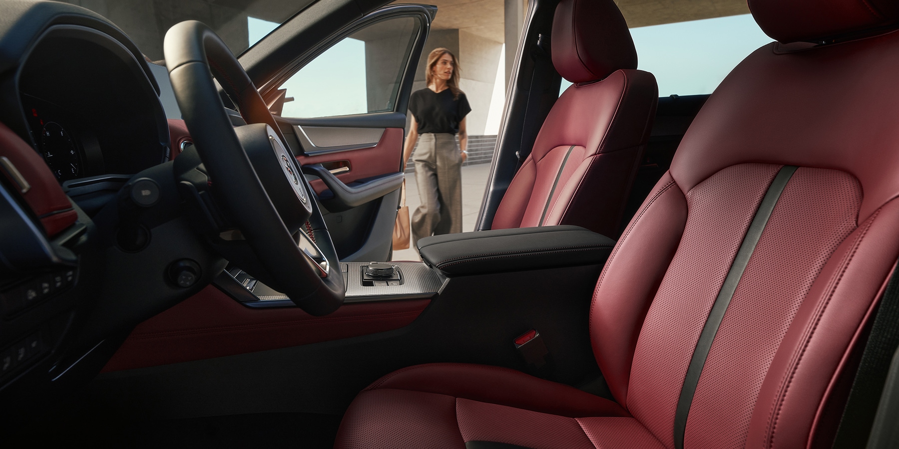 Elegance and utility blend in the welcoming interior of the Mazda CX-70, with crafted details like available Red Nappa leather-trimmed seats.